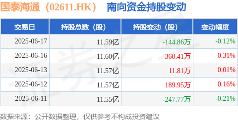 国泰海通(02611.HK):6月17日南向资金减持144.86万股
